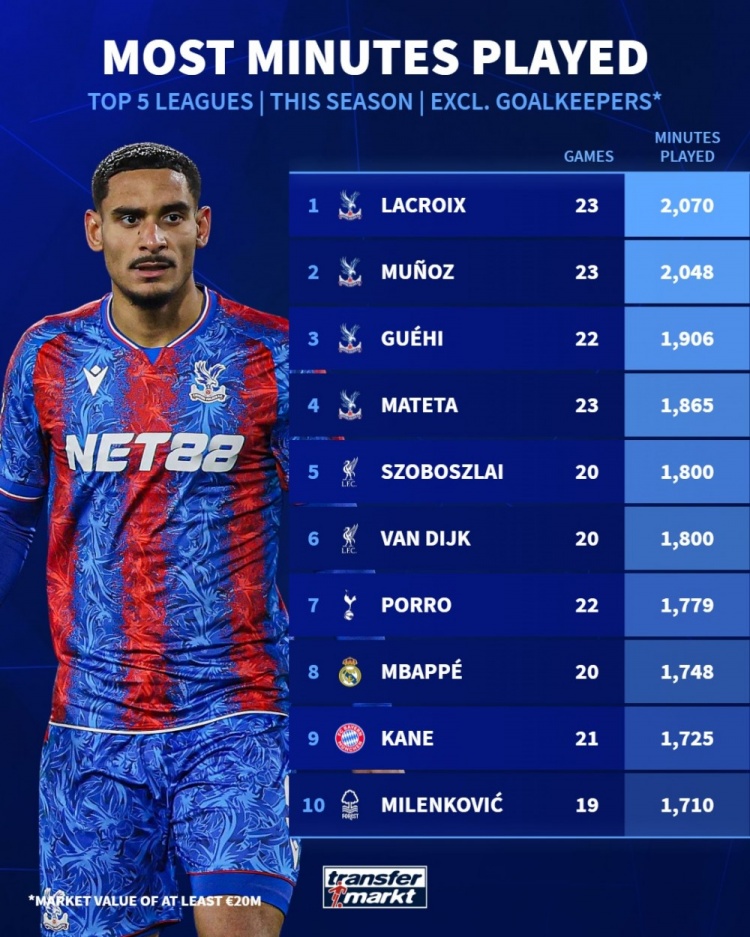 直播吧12月5日讯 德国转会市场统计了本赛季五大联赛非门将球员的出场时间,并列出榜单,水晶宫球员占据前四名,范戴克第六,姆巴佩第八、凯恩第九。