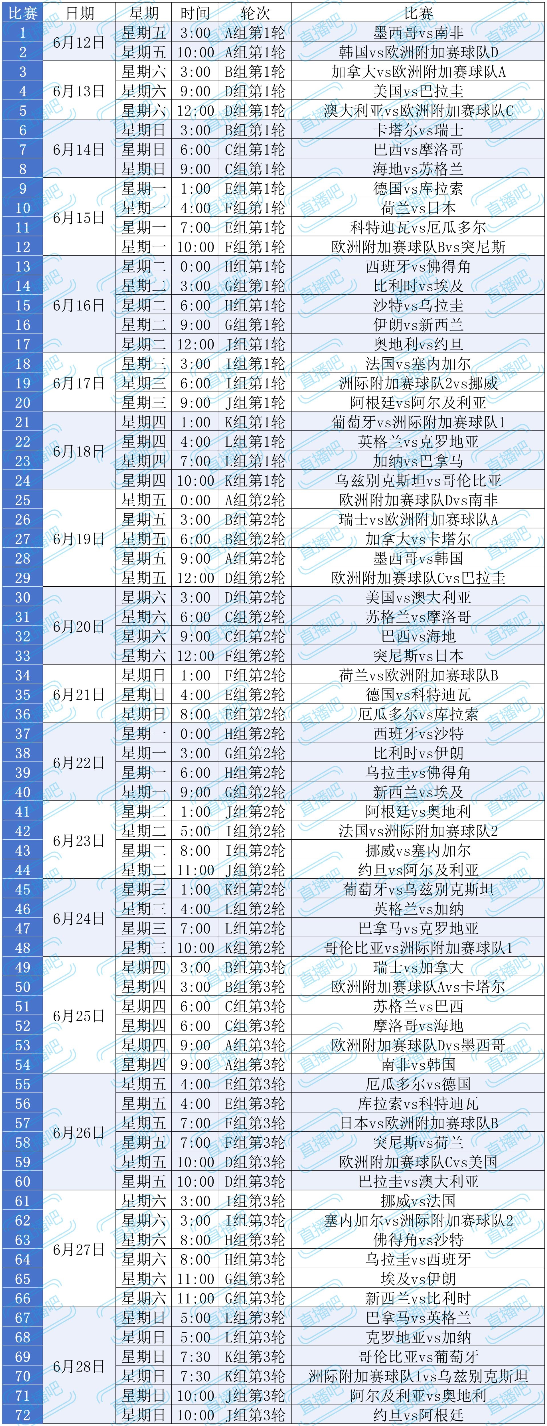 韩国vs欧洲附加赛球队D:6月12日星期五,10:00