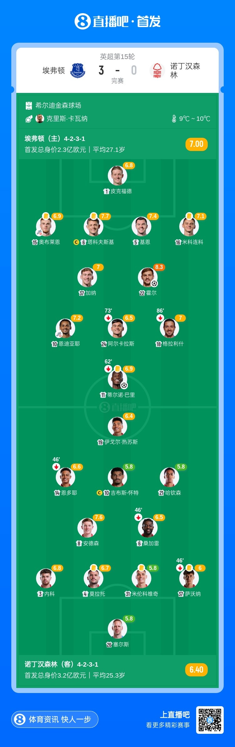 直播吧12月7日讯 北京时间23:00,英超第15轮埃弗顿vs诺丁汉森林,比赛在希尔迪金森球场打响!上半场,霍尔制造米伦科维奇的乌龙;恩迪亚耶长途奔袭助攻蒂尔诺·巴里破门!下半场,霍尔破门锁定胜局!最终,埃弗顿3-0完胜诺丁汉森林。