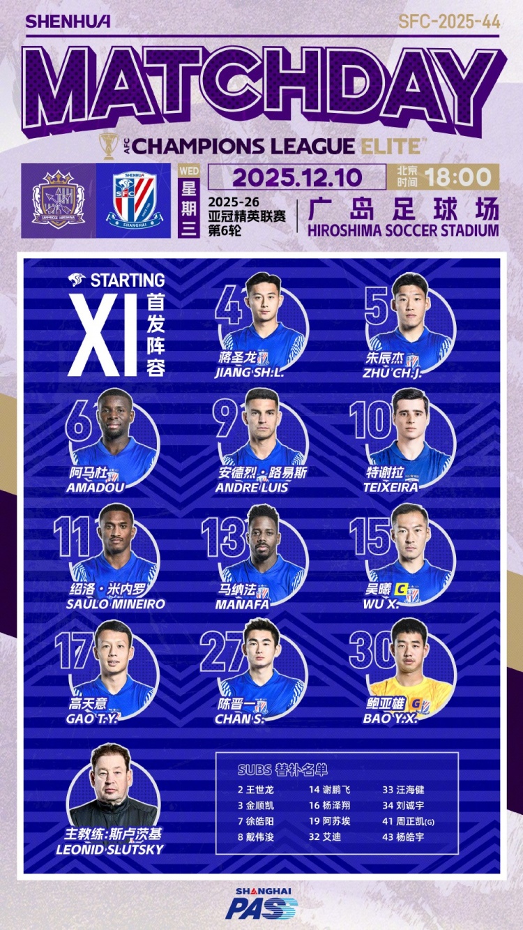 2025/26 亚冠精英联赛第6轮:广岛三箭vs上海申花,首发名单
