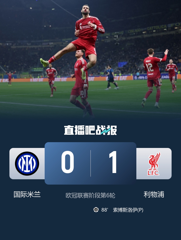 直播吧12月10日讯 北京时间12月10日凌晨4:00,欧冠联赛阶段第6轮,国际米兰坐镇梅阿查球场迎战利物浦。上半场恰尔汗奥卢和阿切尔比先后伤退,劳塔罗飞铲罗伯逊染黄,科纳特破门因埃基蒂克手球在先无效,国际米兰暂0-0利物浦;下半场索默险些送礼,比赛尾声阶段维尔茨造点,索博斯洛伊点射破门,最终利物浦1-0国际米兰,国米遭遇欧冠两连败。