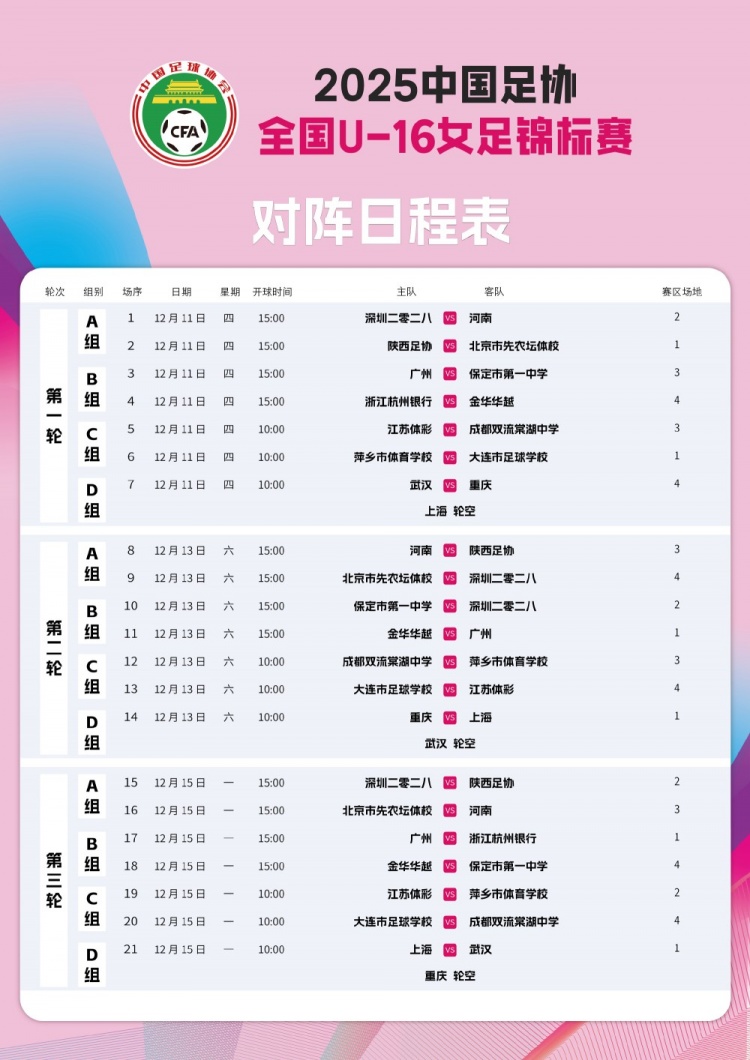 >2025中国足协全国青少年女子足球锦标赛U-16组 赛程表