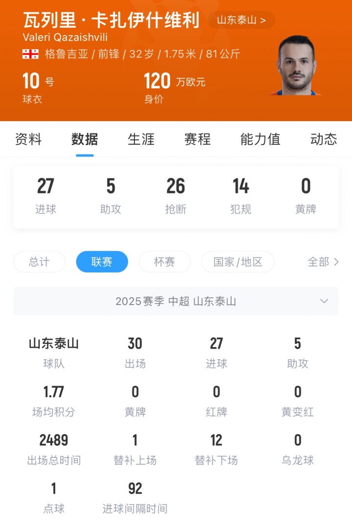 2025赛季,卡扎伊什维利全勤出战了30场中超比赛,贡献27球5助,27球中仅1粒点球,山东泰山最终排名中超第五。这是卡扎伊什维利首次获得中超赛季最佳球员奖。