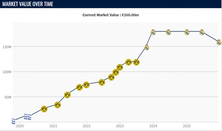本赛季贝林厄姆代表皇马出战17场比赛,贡献4粒进球和3次助攻,2023年7月贝林厄姆以1.27亿欧元的转会费加盟皇马。