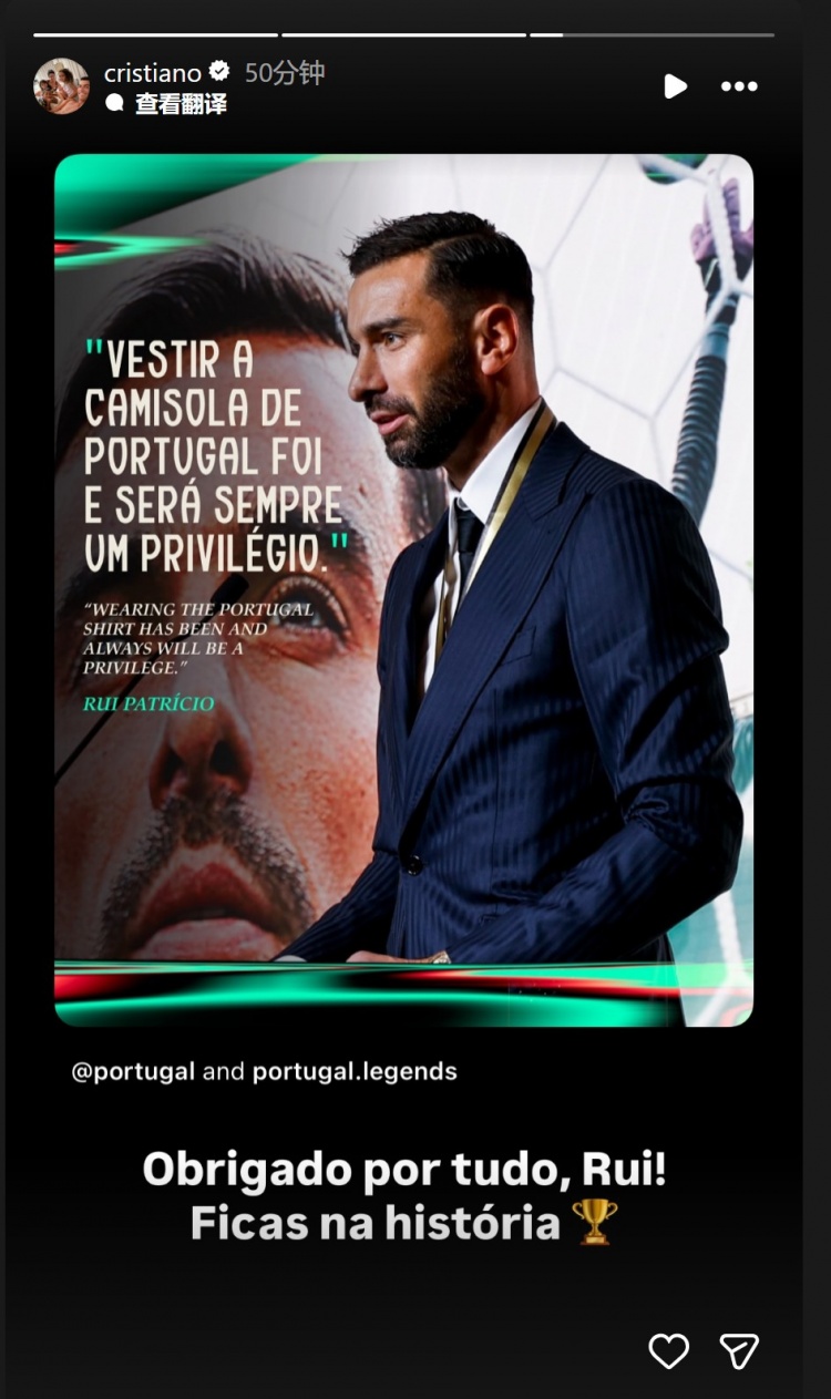 C罗社媒转发帕特里西奥退役的海报,配文:“感谢你所做的一切,鲁伊!你已载入史册。”