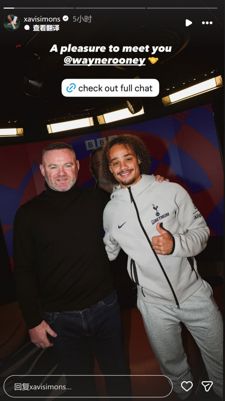 直播吧12月13日讯 热刺攻击手哈维·西蒙斯更新社媒动态,晒出与鲁尼的合照。