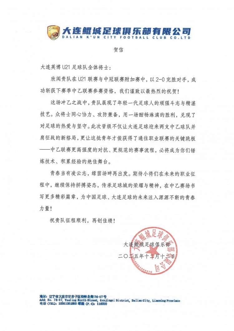 祝贺大连英博U21队成功冲乙!期待小将们未来更多精彩发挥。