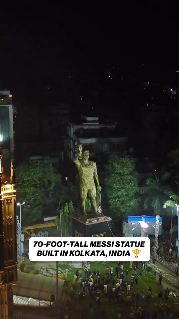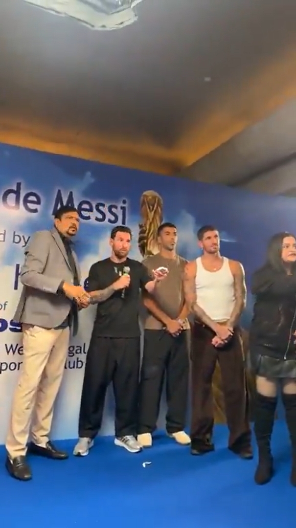 直播吧12月13日讯 梅西今日开启印度行,他与苏亚雷斯、德保罗一起在加尔各答的凯悦酒店出席了梅西雕像揭幕仪式,梅西亲自按下遥控器为这座21米的梅西雕像揭幕。