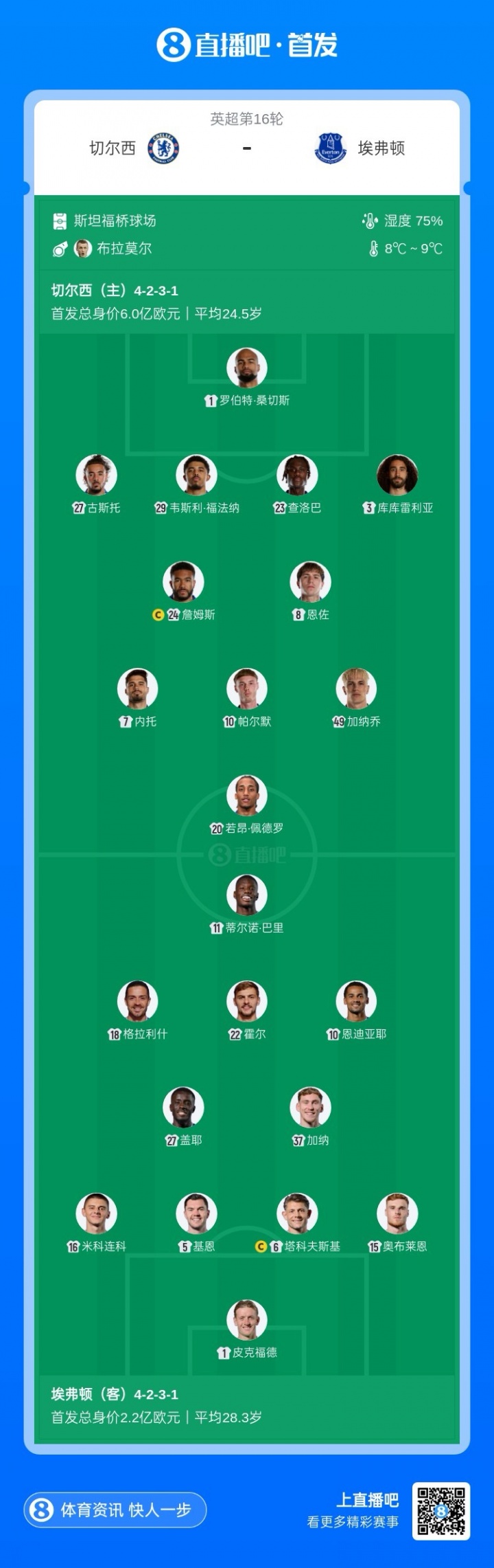 切尔西首发:1-桑切斯、3-库库雷利亚、23-查洛巴、29-福法纳、27-古斯托、24-詹姆斯、8-恩佐、10-帕尔默、7-内托、20-若昂·佩德罗、49-加纳乔