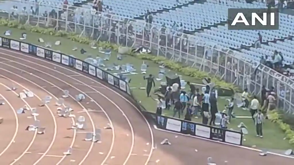 梅西开启印度行,他来到盐湖体育场向场内的球迷们挥手致意,并与场上的球员们互动,但印度球迷对梅西只是短暂停留,以及活动组织不善感到不满,梅西离开之后,球迷向场内投掷水瓶和椅子,还冲进球场搞破坏。