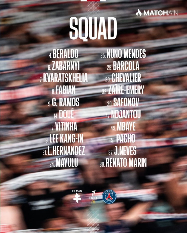 中场:8-法比安、17-维蒂尼亚、24-马尤卢、33-扎伊尔·埃梅里、87-若昂-内维斯