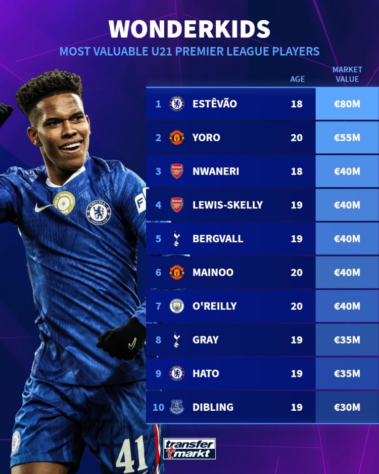 直播吧12月13日讯 德国转会市场列出了英超U21球员身价排名,埃斯特旺8000万欧居首,约罗5500万欧次席。