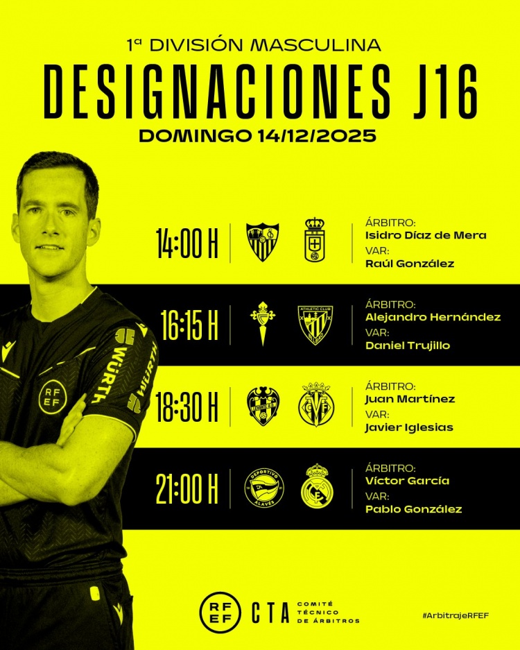 直播吧12月13日讯 西甲官方公布了12月14日四场比赛的裁判安排,维克托·加西亚执法阿拉维斯vs皇马。