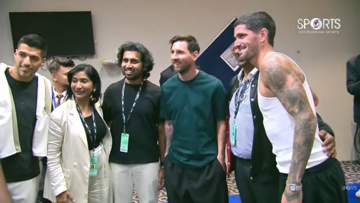 梅西、苏亚雷斯和德保罗与当地官员传球互动↓