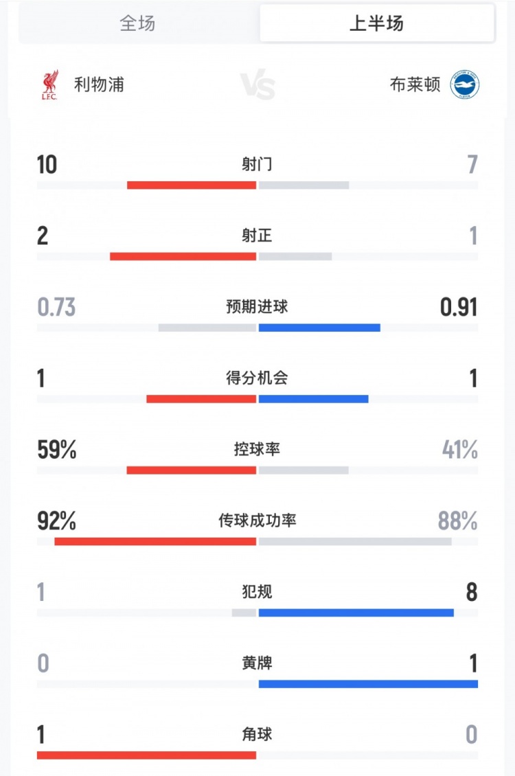 直播吧12月13日讯 英超第16轮,利物浦主场对阵布莱顿,利物浦半场1-0领先,两队上半场数据如下(主队利物浦在前):