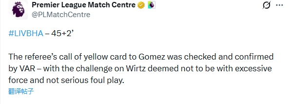 英超官方随后解释判罚:主裁判对戈麦斯出示黄牌的决定经VAR核查确认,因其对维尔茨的犯规动作未使用过度力量,亦不构成严重犯规。