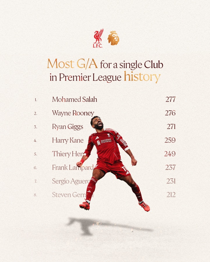 萨拉赫英超中为利物浦直接参与277球(188球,89助),超越鲁尼成英超历史中为单一俱乐部直接参与进球最多的球员。