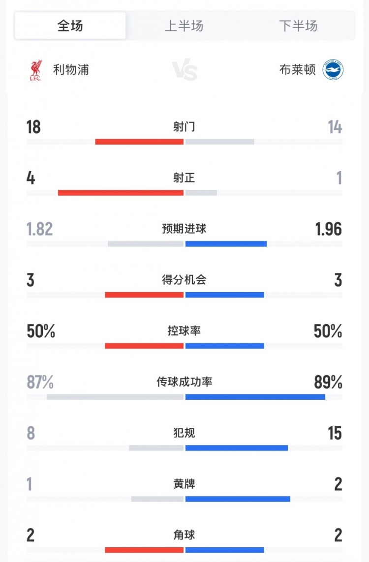 直播吧12月14日讯 英超第16轮,利物浦主场2-0击败布莱顿,两队全场数据如下(主队利物浦在前):