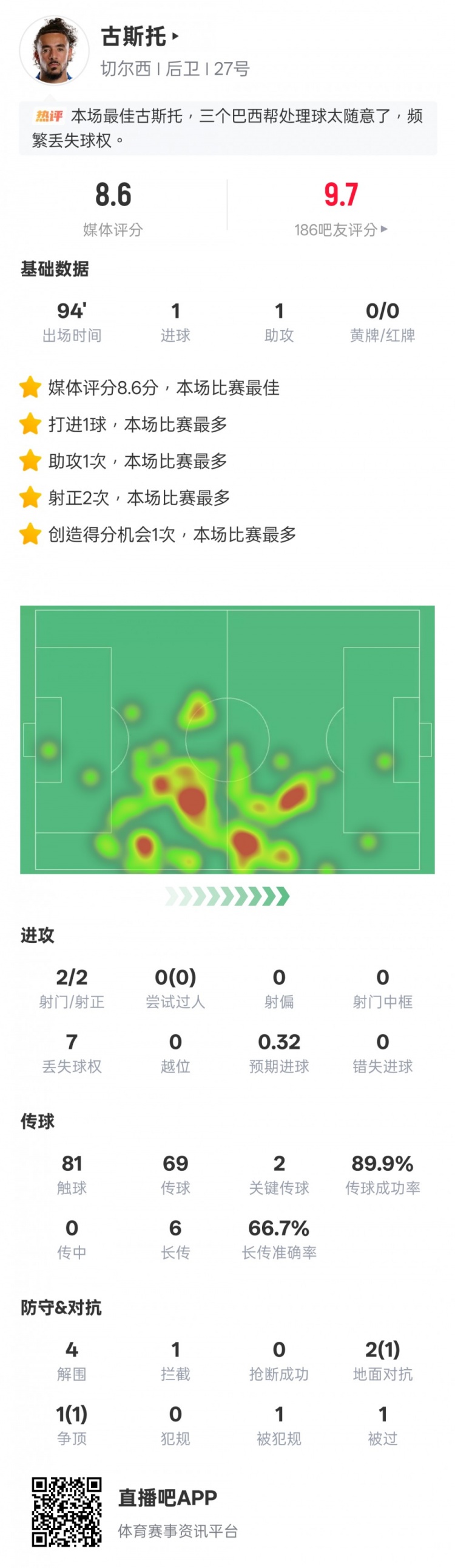 直播吧12月14日讯 2025-26赛季英超第16轮,切尔西2-0埃弗顿。古斯托首发出战,传射建功,还送出2次关键传球,4次解围,评分8.6全场最高。