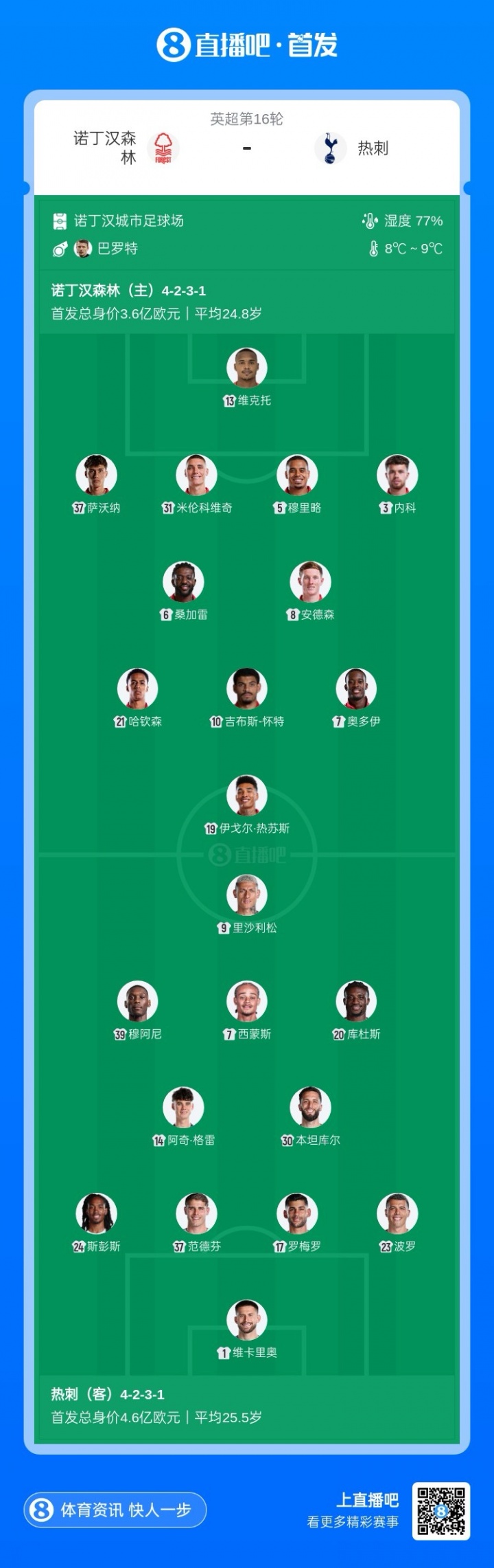 直播吧12月14日讯 北京时间22:00,英超第16轮诺丁汉森林vs热刺。赛前,双方公布本场比赛名单。