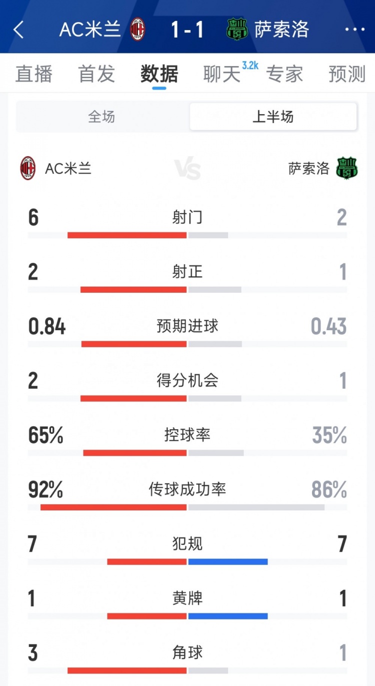 直播吧12月14日讯 本轮意甲AC米兰对阵萨索洛上半场结束,双方暂时1-1战平,以下为双方半场数据对比: