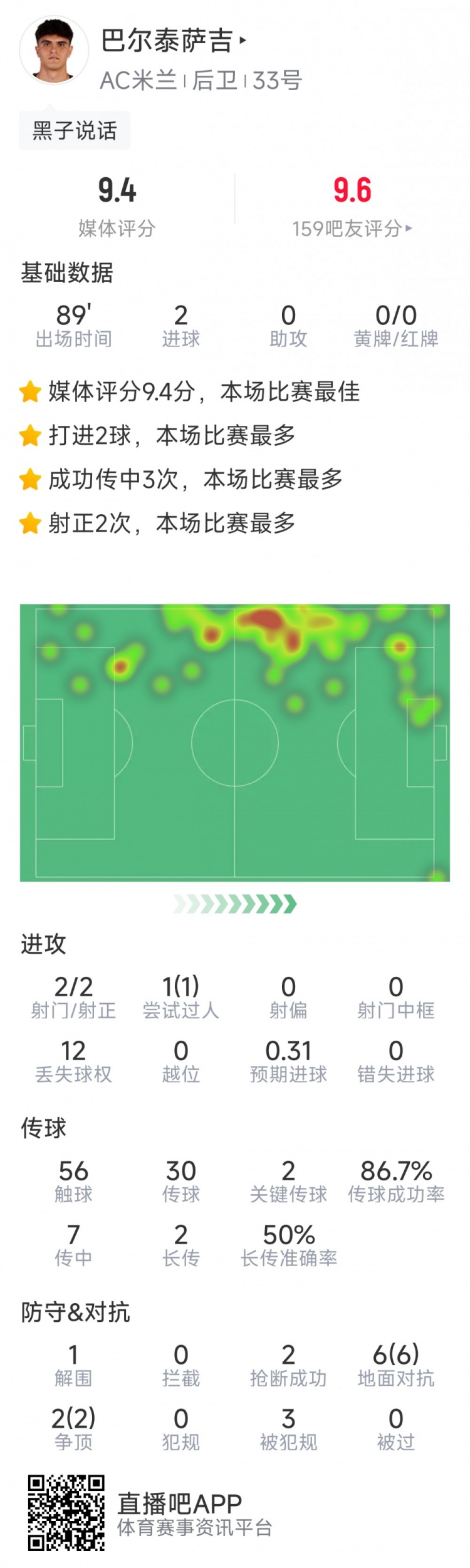 直播吧12月14日讯 在本轮意甲,AC米兰2-2战平萨索洛。本场比赛19岁小将巴尔泰萨吉梅开二度,以下为他在本场数据: