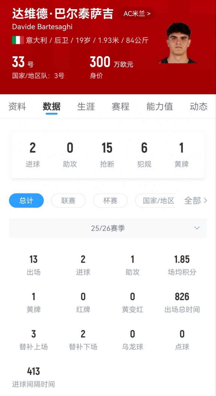 巴尔泰萨吉本赛季代表米兰出战13场,贡献2球1助攻,目前他的德转身价仅有300万欧,本月德转更新意甲身价,巴尔泰萨吉或许会有较大幅度的提升。