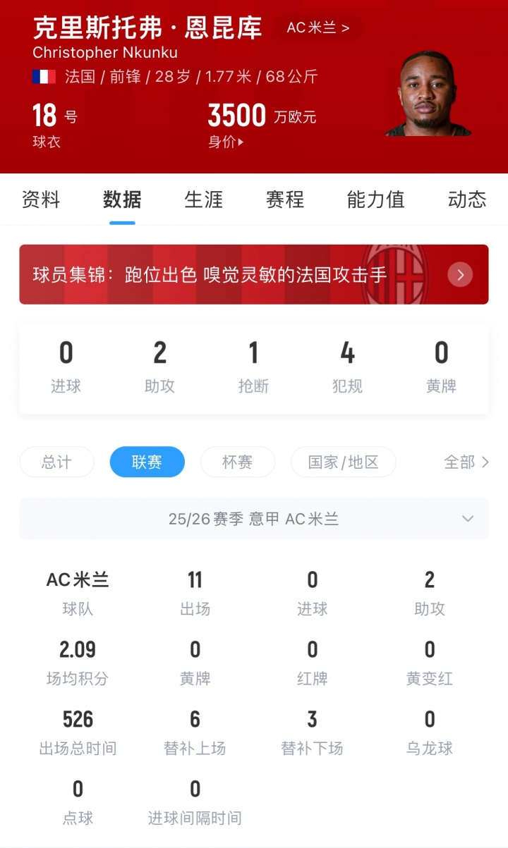 恩昆库目前已经为米兰在意甲出场了11次,送出2次助攻但仍未收获联赛首球。据capolpgy数据,恩昆库年薪926万欧,是米兰全队的顶薪水平。