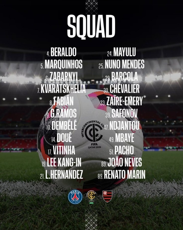 直播吧12月14日讯 巴黎将在北京时间12月18日洲际杯决赛面对弗拉门戈,球队官方也公布了本场大名单,具体如下: