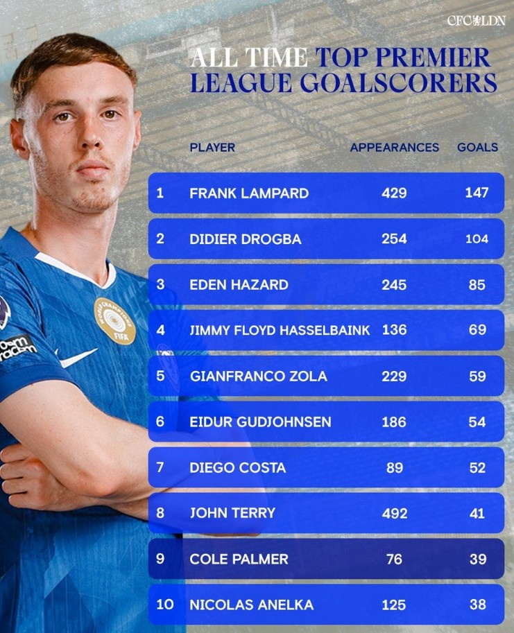直播吧12月14日讯 在本轮英超切尔西2-0击败埃弗顿的比赛中,帕尔默破门。切尔西官方也晒出了队史英超射手榜,帕尔默升至第9,具体榜单如下: