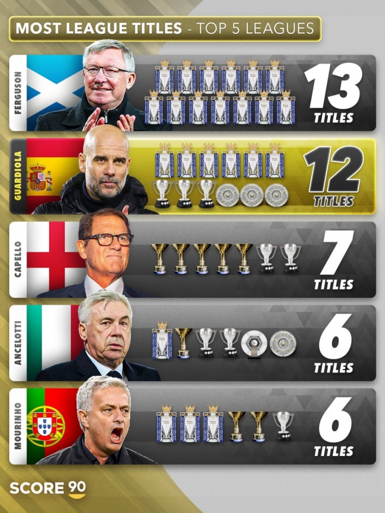 ② 瓜迪奥拉 6座英超冠军+3座西甲冠军+3座德甲冠军 12座