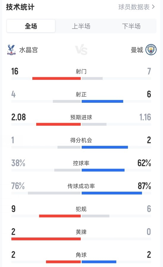 直播吧12月14日讯 2025-26赛季英超联赛第16轮,水晶宫0-3不敌曼城。