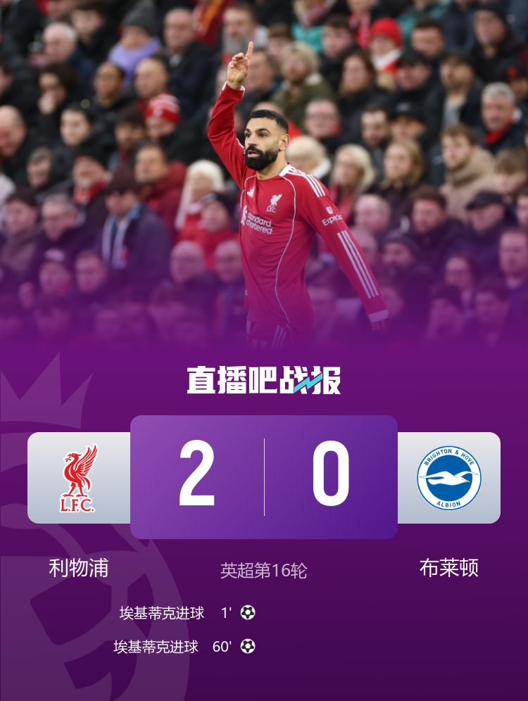 直播吧12月14日讯 北京时间12月13日晚上23:00,英超第16轮,利物浦坐镇安菲尔德球场迎战布莱顿。上半场,埃基蒂克46秒带球进场,阿利松拒单刀,戈麦斯伤退、萨拉赫替补,迭戈·戈麦斯脚踹维尔茨染黄。下半场,萨拉赫助攻埃基蒂克头球破门。全场结束,利物浦2-0布莱顿。本场过后,利物浦8胜2平6负积26分排名第六;布莱顿6胜5平5负积23分位列第九。