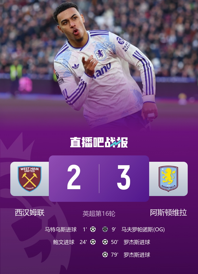 直播吧12月14日讯 北京时间22:00,英超第16轮西汉姆联vs阿斯顿维拉,比赛在伦敦体育场打响!上半场,马特乌斯闪击破门,马夫罗帕诺斯自摆乌龙,随后鲍文破门帮助西汉姆联再次领先!下半场,罗杰斯梅开二度!最终,维拉3-2击败西汉姆联,各项赛事豪取9连胜!距离英超榜首仅差3分!