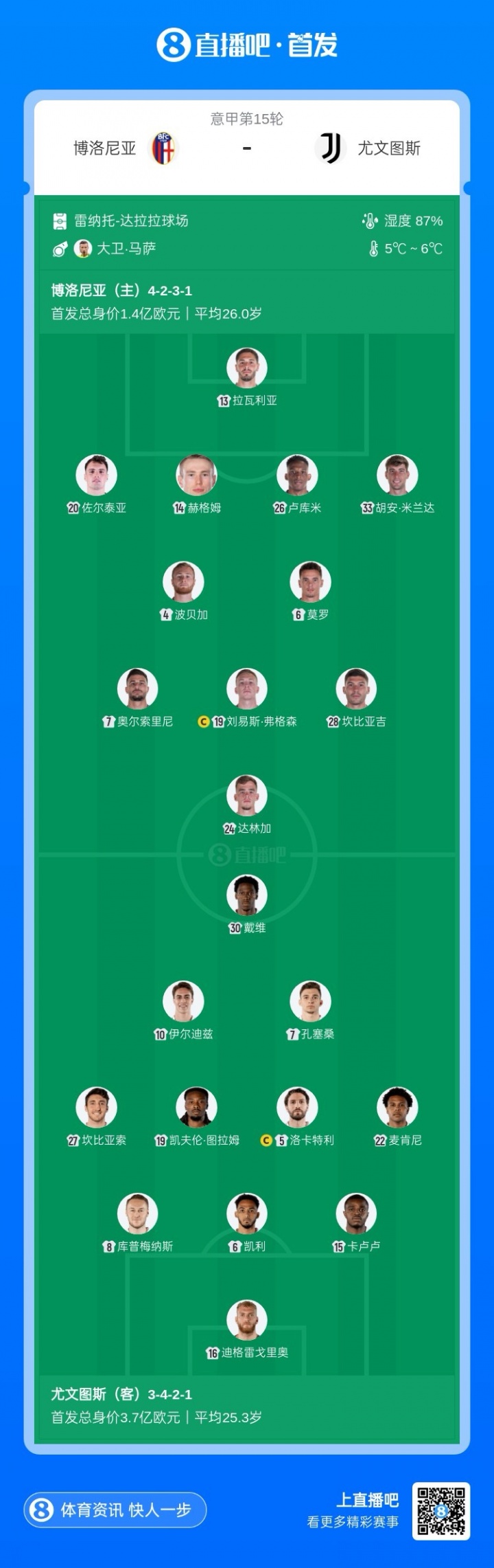 直播吧12月15日讯 意甲第15轮,博洛尼亚迎战尤文比赛即将打响。赛前首发出炉。