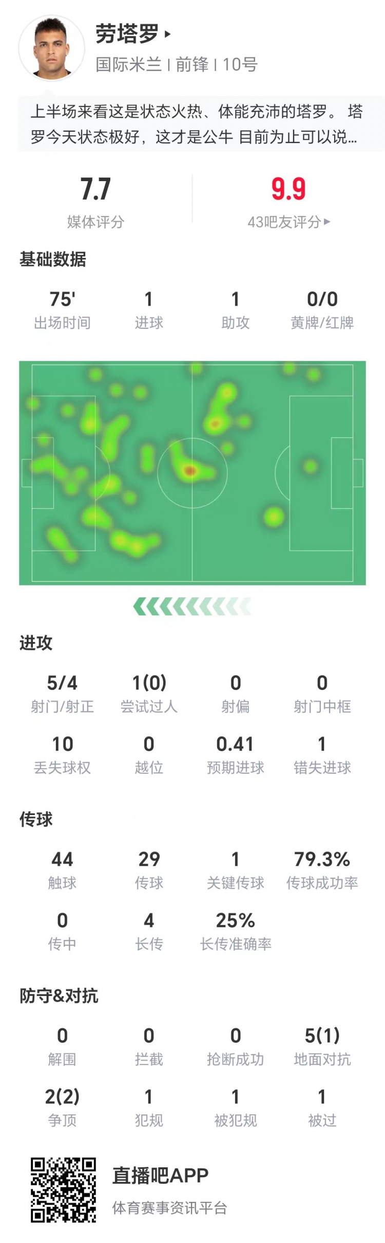 技术统计数据显示,劳塔罗本场比赛5射4正,1次错失进球,1次关键传球,5次地面对抗成功1次,两次争顶全部成功,获评7.7分。