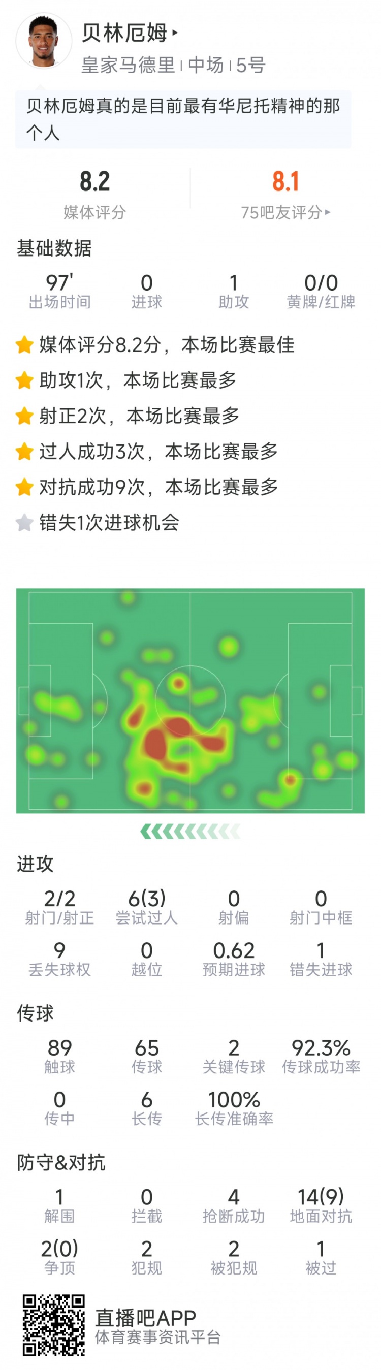 直播吧12月15日讯 在本轮西甲,皇马2-1击败阿拉维斯。贝林厄姆本场送出助攻,以下为他在本场数据: