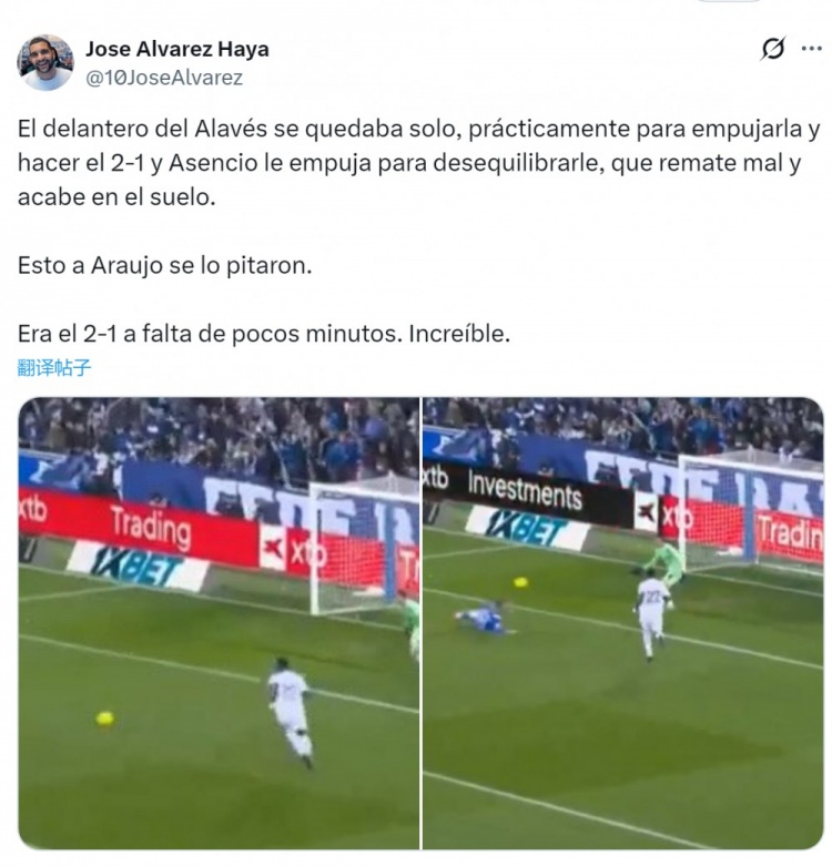 记者Jose Alvarez Haya社媒写道:“阿拉维斯前锋当时已直面门将,几乎可以轻松将球推入球门,将比分改写为2-1。而阿森西奥从身后推搡,使他失去平衡,导致射门偏出并摔倒在地。阿劳霍此前(类似情况)就被判了点球。”