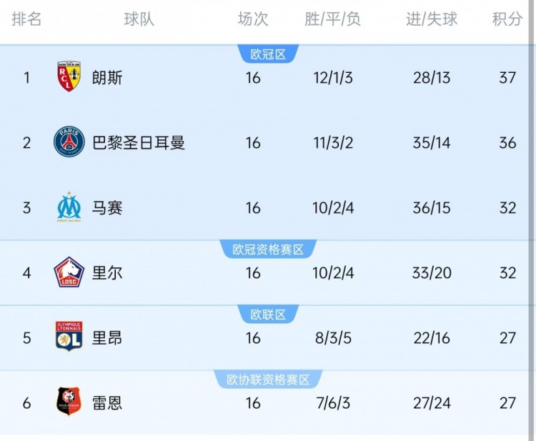 直播吧12月15日讯 法甲第16轮比赛战罢,朗斯37分居首,巴黎36分次席,马赛、里尔同积32分。