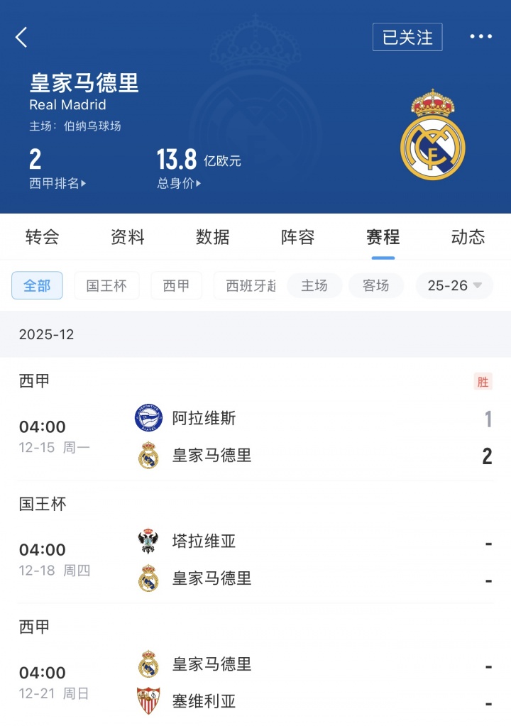 皇马2025年剩余赛程