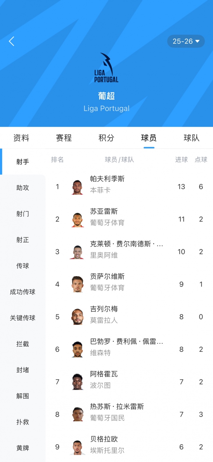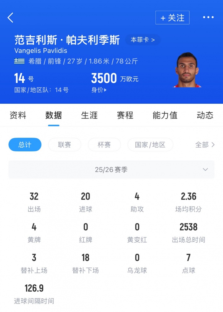 本赛季他代表本菲卡各项赛事出战30场贡献20球4助,联赛出战14场贡献13球3助领跑葡超射手榜。球员目前身价3500万欧。