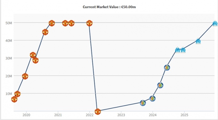 直播吧12月15日讯 德转今日更新法甲球员身价,马赛球员格林伍德身价上涨1000万,目前身价5000万欧追平曼联巅峰时期。