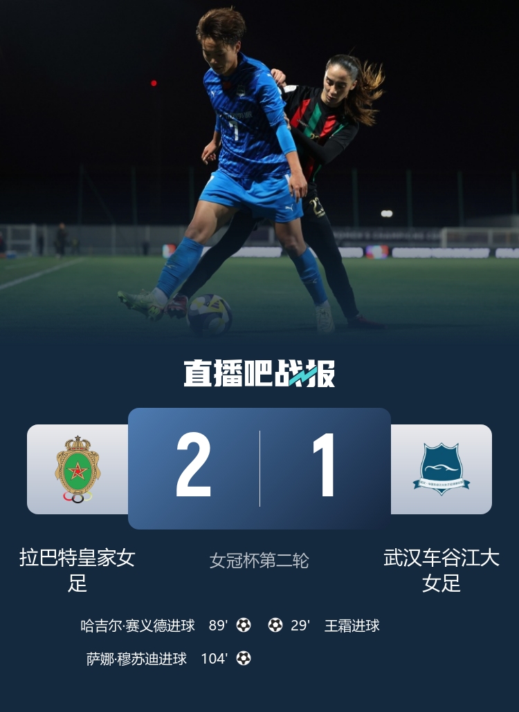 直播吧12月15日讯 北京时间12月15日02:00,女冠杯第二轮武汉车谷江大女足挑战拉巴特皇家女足的比赛在穆莱阿布德拉赫体育场进行,上半场王霜小角度爆射世界波首开记录,下半场穆苏迪禁区倒地未判罚,王霜失单刀,赛义德头球绝平,最终常规时间结束武汉女足1-1拉巴特皇家女足,加时赛穆苏迪推射反超比分,最终武汉女足加时1-2拉巴特皇家女足无缘战阿森纳女足。