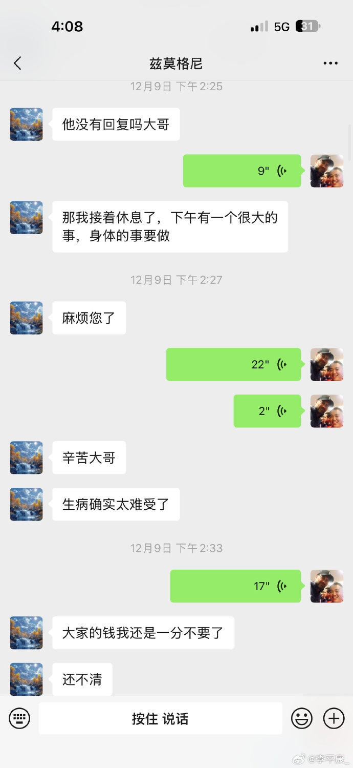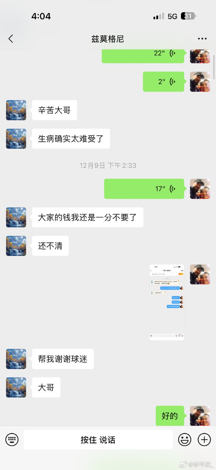 直播吧12月16日讯 媒体人李平康晒出了去世球迷生前最后的微信回复。