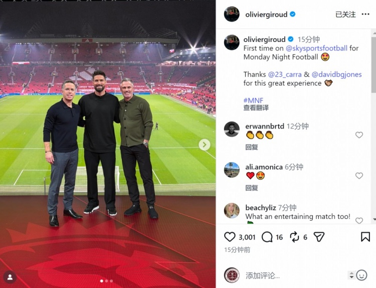 直播吧12月16日讯 吉鲁更新社媒动态,晒出与卡拉格、大卫·琼斯(天空体育主持人)的合照。