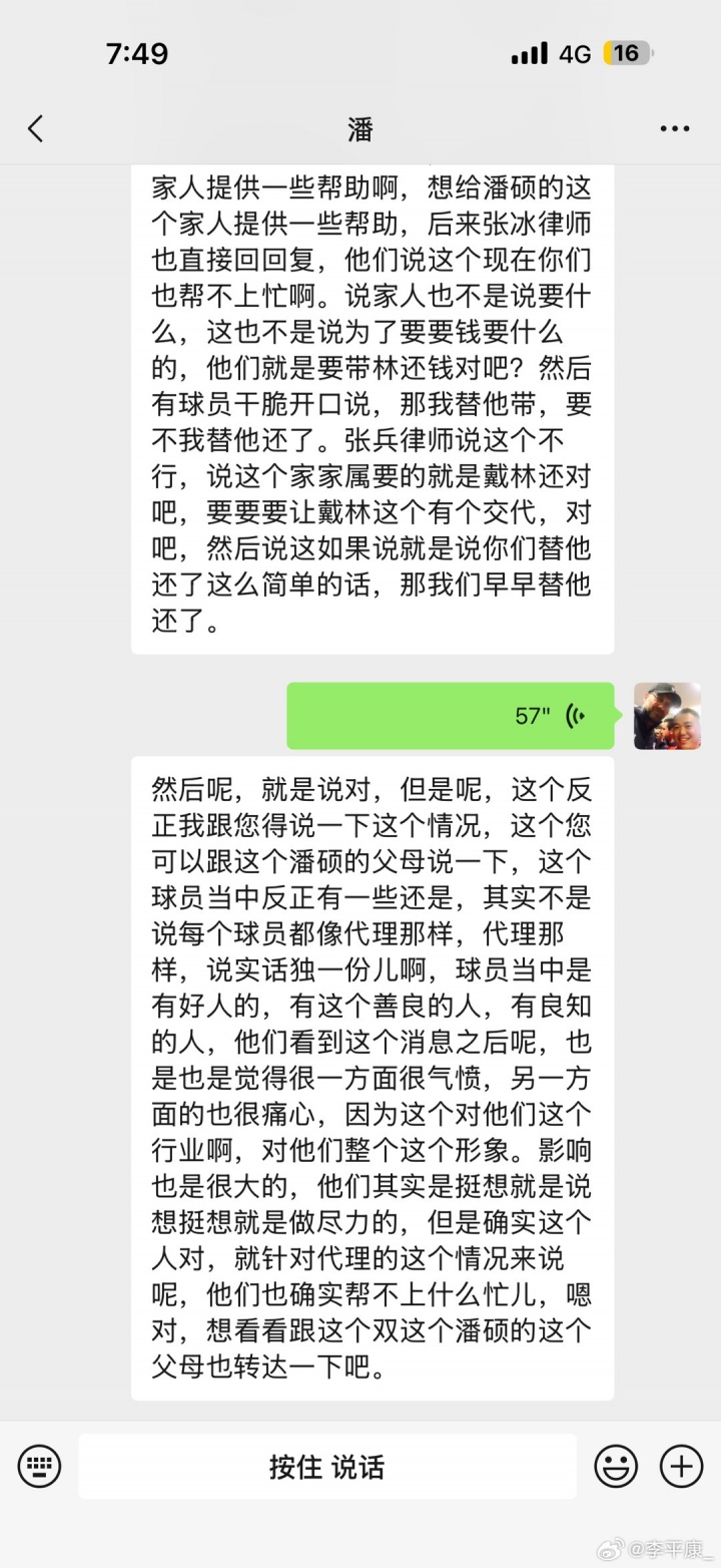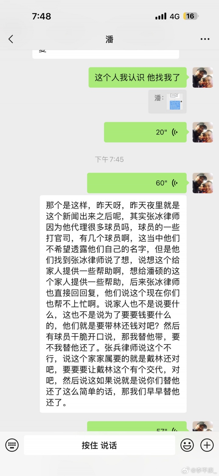 直播吧12月16日讯 媒体人李平康在社媒发文,表示在被戴琳欠钱的球迷潘硕去世的消息传出后,有几名球员联系李平康想向潘家提供帮助,其中也有著名国脚,潘家人不想要捐款,只想要戴琳还钱。