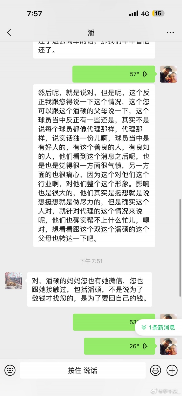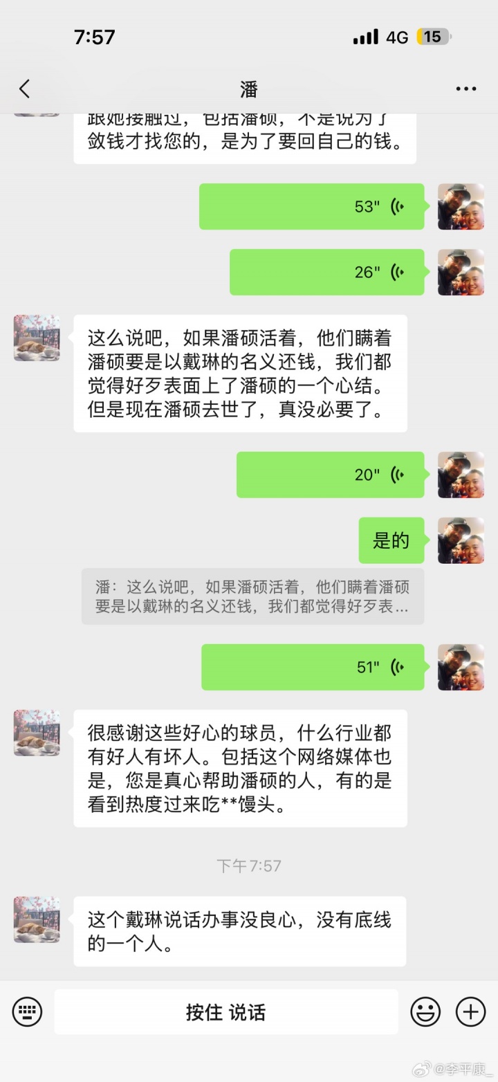 昨天晚上潘硕去世的消息传出后,有几个球员联系到张冰律师和我,这其中基本都是张律的代理客户,有著名国脚也有自己还被欠薪的小孩。他们询问潘硕家人目前的需要,希望能够匿名为潘硕家人提供经济上的帮助,我们也解释了由于潘硕已经离世,潘家人并不想要捐款,只想要戴琳还钱,在这点上他们确实帮不上忙。还有球员说戴琳差多少钱他来还,这个张律也解释了,冤有头债有主,人家需要的是戴琳还,如果谁还都行我们早就补上了!