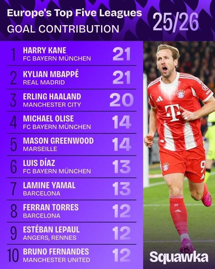 2025-26赛季五大联赛参与进球(进球+助攻)数据: