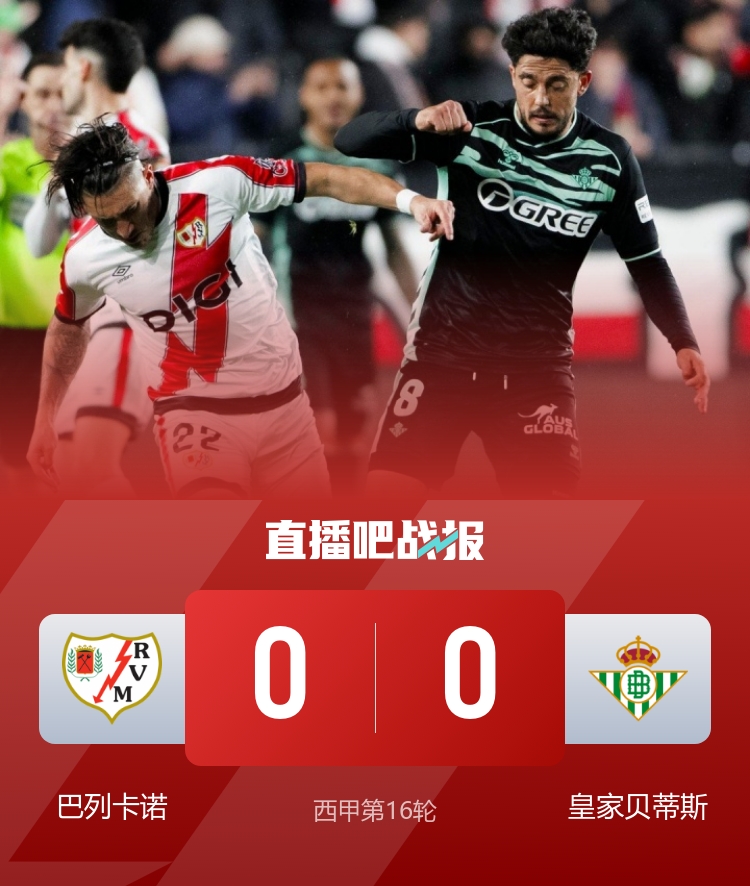 下半场补时3分钟,巴列卡诺0-0贝蒂斯。