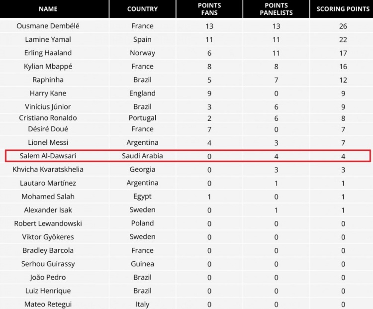 直播吧12月17日讯 FIFA年度最佳阵容投票,沙特前锋萨利姆·多萨里没有获得球迷投票,但他在专家投票获得4分。